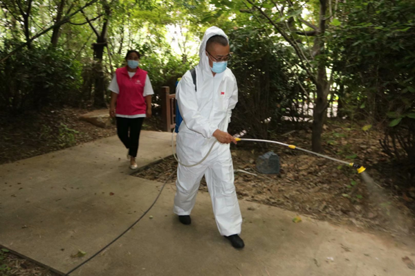 志愿者对公园死角进行消杀作业