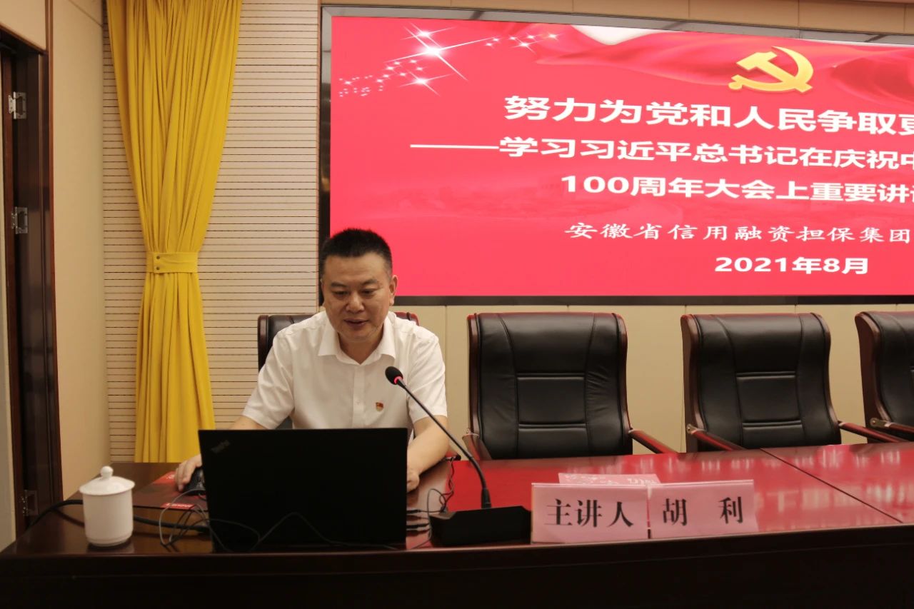 8月27日,省信用担保协会常务副会长兼秘书长、省国资委党委“举旗帜·送理论”宣讲团成员胡利赴省农担公司做“举旗帜·送理论”基层党史专题宣讲报告会,为省农担公司全体党员作题为《为党和人民争取更大光荣——学习习近平总书记在庆祝中国共产党成立100周年大会上重要讲话精神》的宣讲报告。