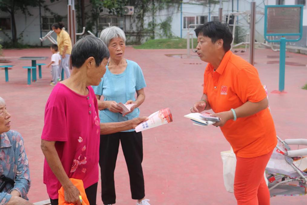 志愿者发放宣传册,并向居民讲解相关慈善政策
