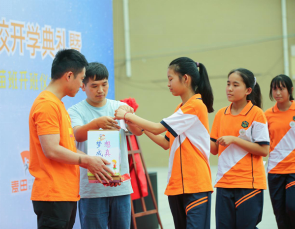 朗诵结束之余,麦苗班学生代表现场发言,向共同为麦苗班付出心力的国祯基金会、麦田教育基金会以及现场的嘉宾、领导表示感谢,并向国祯慈善基金会理事长李泓萱女士赠送了麦苗胸针。