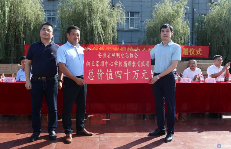 为改善王家坝中心学校教育环境、保障孩子们的视力健康,2021年9月30日,安徽省照明电器协会向王家坝中心学校捐赠了价值40万教育照明护眼灯具,安徽省照明电器协会组织了符合新国家标准的教育照明灯具,参与公益活动的品牌有:雷士照明、世林照明、飞利浦照明、三雄极光照明、欧普照明、新广联照明。