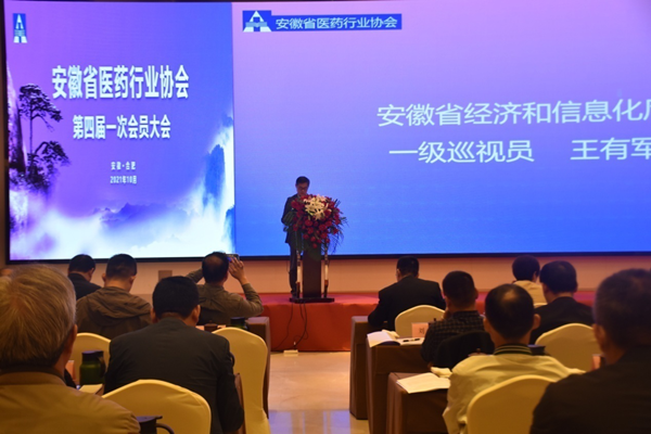 2021年10月14日,安徽省医药行业协会四届一次会员大会在合肥召开。安徽省经济和信息化厅一级巡视员王有军、安徽省药品监督管理局副局长姚强、安徽省社会组织管理局唐麟处长出席会议。