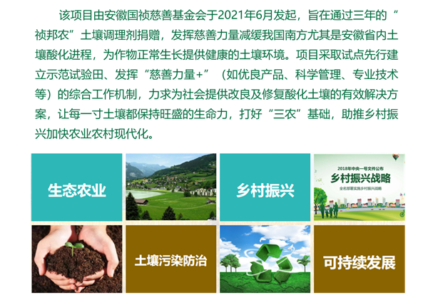 该项目向无为市2个乡镇共捐赠150吨“祯邦农”土壤调理剂,主要用于当地主要大田作物和经济作物,如水稻、白茶的酸化土壤改良及修复,并建立示范试验田,打造特色示范基地,开展为期3年的土壤改良及修复工作。