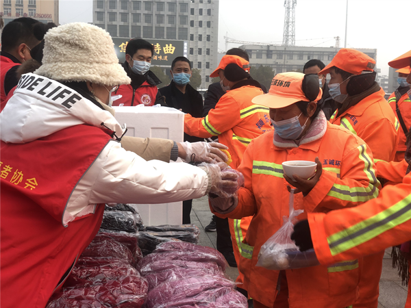 阜阳市乐善志愿者协会组织志愿者在阜阳火车站站前广场,开展“粥粥暖人心 浓情腊八节”弘扬传统文化志愿者服务活动,为200名环卫工人送上爱心腊八粥和慰问品。