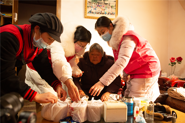 阜阳市关爱“三留守”志愿者协会志愿者将腊八粥送至行动不便老人的家里。