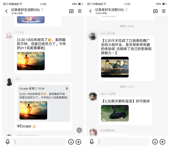 据了解,3月29日至4月10日期间,研究院作为安大外语学院师生心理服务的项目执行方,已对该大学生们开展了数期“记录美好生活”线上分享活动。在每期活动中,得到了校方的积极支持,同学们也踊跃参加,通过线上QQ群分享着每天的“小确幸”:有的学习做美食、有的做打卡运动、有的拍摄美景、还有的练习书法、学画画等等。“今天食堂有新菜品啦,好好吃呀!”、“春天里的花花草草真好看,满满的希望!”、“1000米测完了,虽然跑的不快但我尽力啦”……同学们在受限的条件中制造欢乐,不经意间传递着温暖与感动。