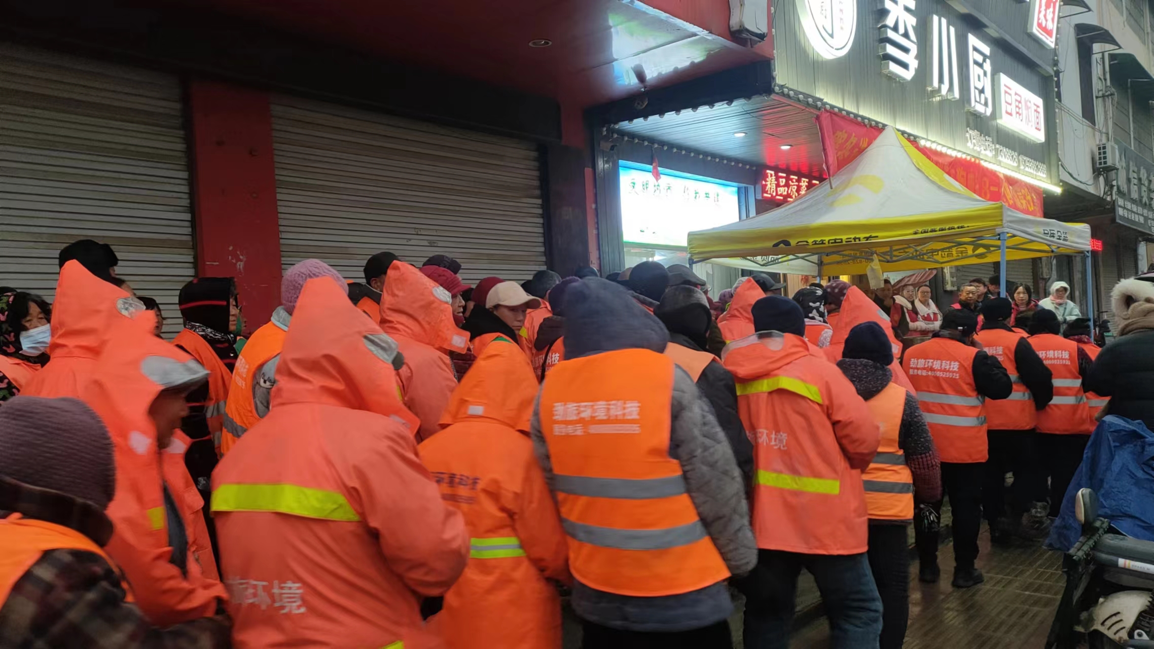 1月17日清晨,涡阳县下着雨,温度接近零度,但是为了开展好送粥活动,志愿者们克服困难,冒着雨顶着寒,天没亮摸着黑到达活动现场。大家分工明确,各司其职,活动现场热火朝天,大家有说有笑,呈现出腊八节前的热闹场景。