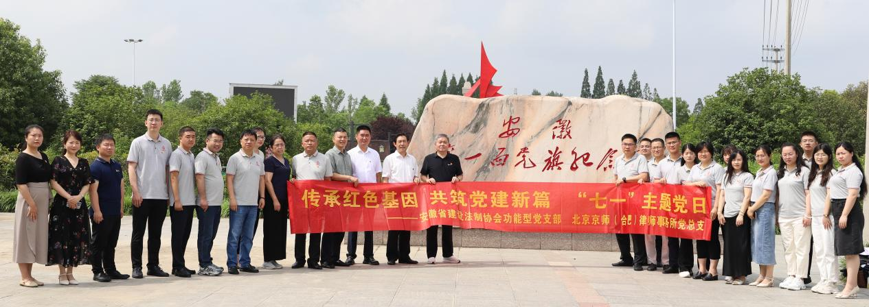 为庆祝中国共产党成立103周年,深入贯彻落实习近平总书记关于党的建设的重要指示精神,7月1日,安徽省建设法制协会功能型党支部与会员单位中共北京京师(合肥)律师事务所党总支共赴安徽省第一面党旗纪念园开展“传承红色基因 共筑党建新篇”七一主题党日活动。
