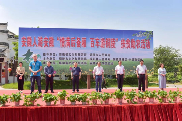 此次活动启动仪式由铜陵市文化和旅游局副局长许丽萍主持,安徽日报农村版报社总编辑陈伟,铜陵市文化和旅游局党组书记、局长徐常宁,枞阳县人民政府副县长吴正芳参加。枞阳县委常委、县政府常务副县长杨贤招,安徽省自驾游协会会长刘超分别致辞,安徽省文旅厅对外合作交流处处长杨柳向自驾游协会代表授旗,铜陵市政府副秘书长查日华宣布了安徽人游安徽——“情满后备厢,百车游铜陵”扶贫助农活动正式开始。