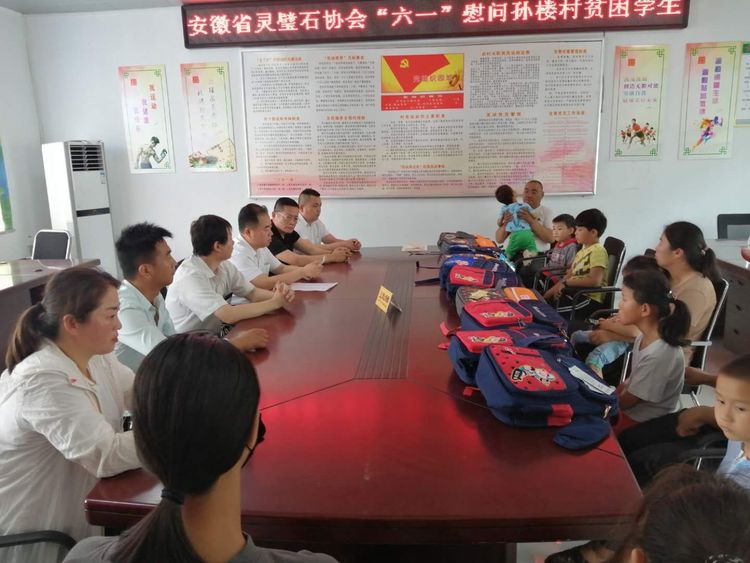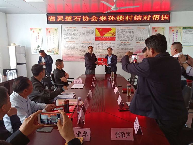 2020年5月12日, 安徽省灵璧石协会赴??徘?父苏蛩锫ゴ蹇?狗銎毒柙?疃?/span>。省灵璧石协会会长黄国强, 栏杆镇委书记史云, ??徘?裾?指本殖ざ我?/span>, ??徘?缁嶙橹?芾砭志殖だ罹?热顺鱿?柙?疃?/span>。产业帮扶方面,与该村签订战略合作协议, 为村积极销售苗圃, 支持村经济发展。教育扶贫方面,向该村学生捐赠1万元助学资金, 以期顺利完成学业, 早日成为国家栋梁之才。文化帮扶方面,向该村捐赠宿州书画名家郭大华、陈晓辉、郭峰、张超、蔡胡等人书画作品和张训彩书籍, 旨在繁荣群众文化生活。健康扶贫方面,向该村捐赠价值8800元的净水系统一台, 捐赠价值5万元的健康体检卡, 旨在提高群众生活水平。公益扶贫方面,向该村贫困户捐赠米面油等生活物资, 旨在改善群众生活质量。
