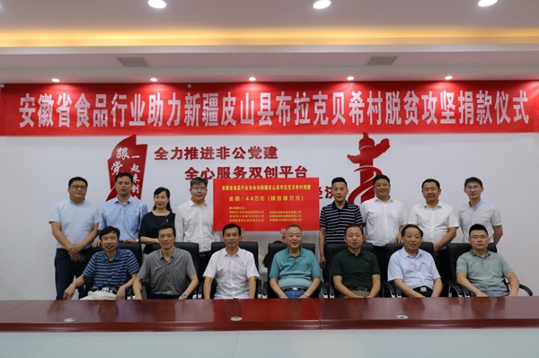 省民政厅社会组织管理局局长、省社会组织综合党委副书记阚家安,新疆自治区驻安徽省新疆籍人员服务管理工作组副书记何建忠,省扶贫办社会扶贫处处长张文、省社会组织综合党委派驻省食品行业协会党建指导员万宗春、省市场监管局食品安全协调处金辉处长、省经信厅盐业与食品处崔翔副处长和安徽省新疆商会郑雨秘书长等出席捐款仪式。