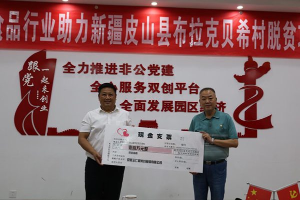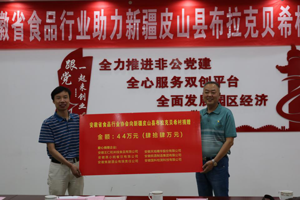 安徽王仁和米线食品有限公司董事长王仁和、安徽蒸小皖餐饮有限公司董事长司武卓代表各自企业分别捐款10万元,安徽焦陂酒业有限责任公司董事长程剑、安徽天地精华股份有限公司总经理张俊涛、安徽皖酒制造集团有限公司副总经理黄芳、安徽国科检测科技有限公司总经理赵成仕代表各自企业分别捐款6万元,六家企业共为皮山县结对帮扶村捐助44万元,用于布拉克贝希村太阳能路灯等项目建设。